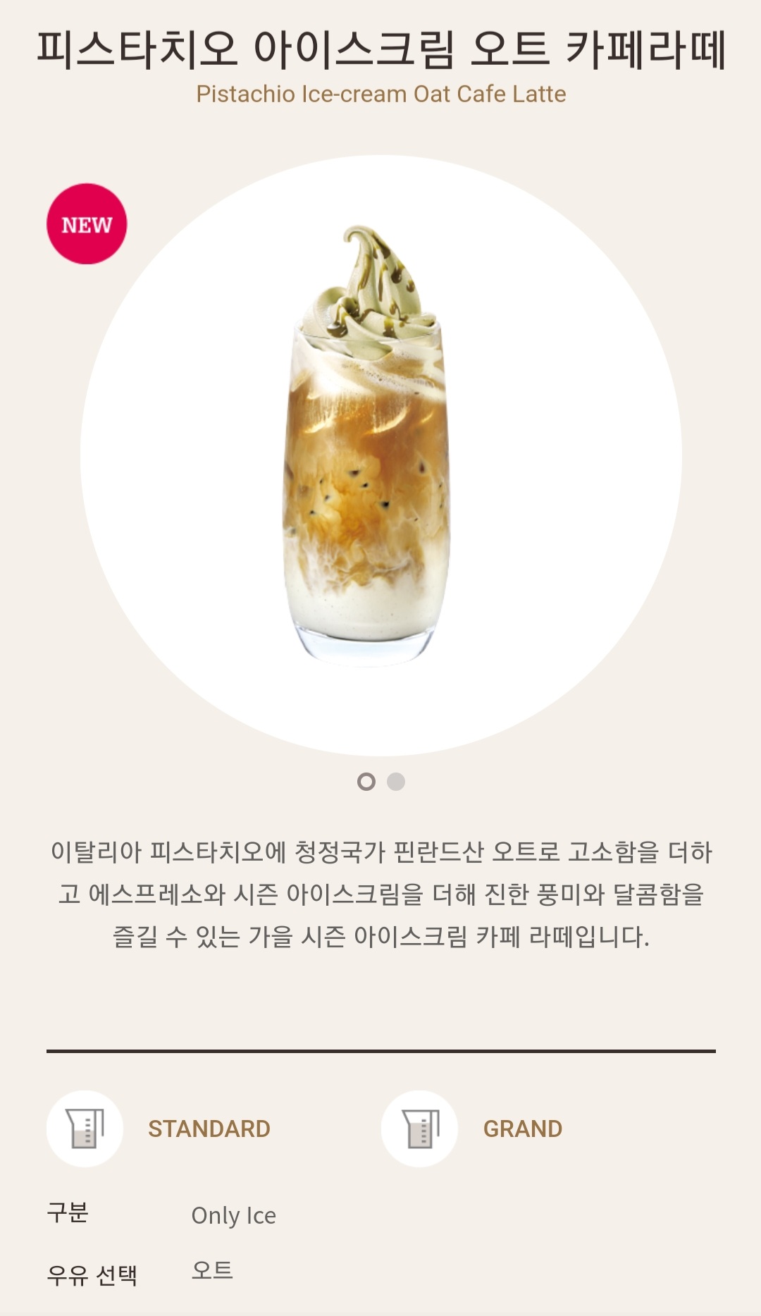 이탈리아 피스타치오에 핀란드산 오트로 고소함을 더하고 에스프레소와 시즌 아이스크림인 피스타치오 아이스크림을 더해 진한 풍미와 달콤함을 즐길 수 있는 가을 아이스크림 카페 라떼의 영양 정보는 다음과 같습니다.