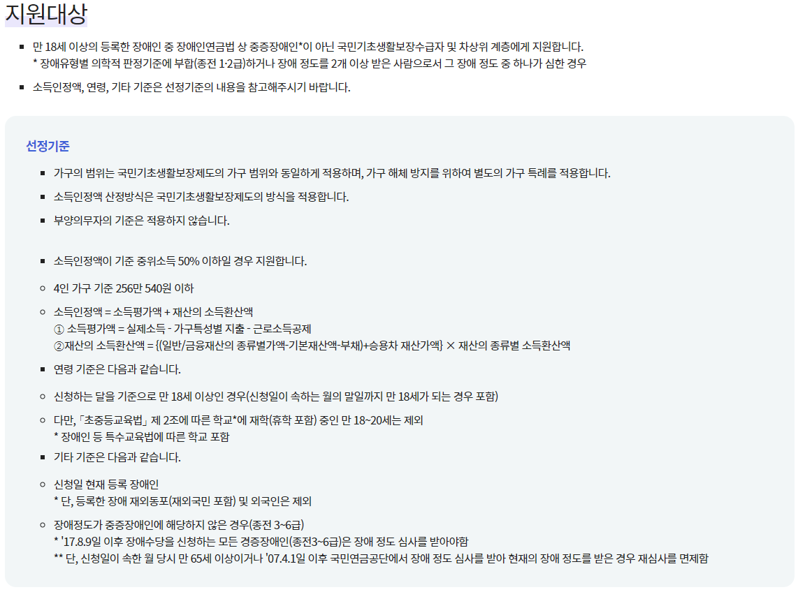 - 장애수당(추가) : 생계·의료·주거·교육급여 수급자 및 차상위는 매월 4만원, 보장시설 수급자는 매월 2만원 지급