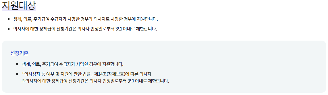 - 장제·해산급여 : 보건복지부 기초생활보장과(문의처:129), 수시 현금지급