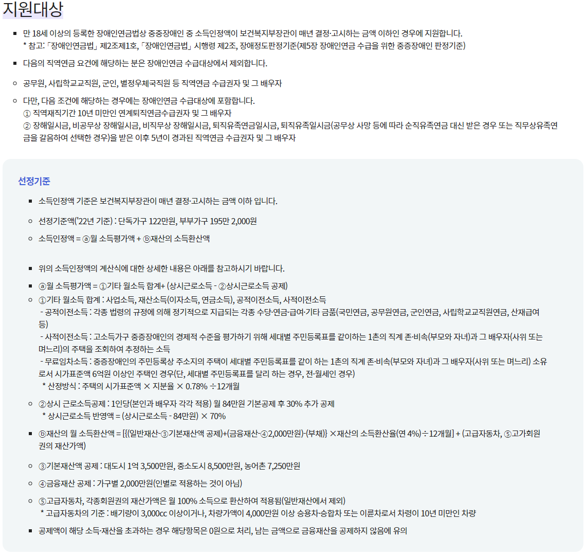- 장애인연금(추가) : 18세~64세까지 매월 기초급여 지급 (2022년 감액 없는 최고지급액 기준 307,500원)
