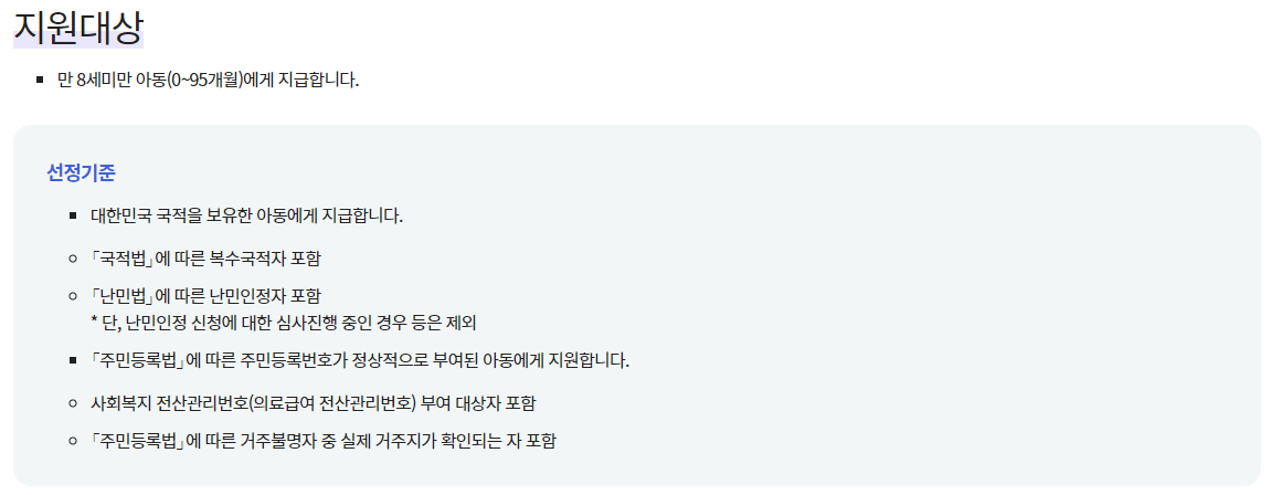 - 아동수당 : 보건복지부 아동복지정책과(문의처:129), 현금지급