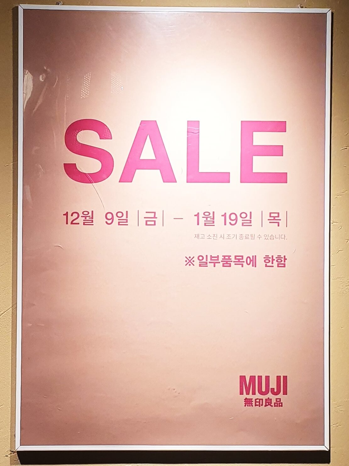 겨울 분위기가 가득 나는 장식에 둘러싸인 거리를 지나다가 우연히 무인양품 세일 간판을 보았습니다. 평소 많이 방문은 브랜드는 아니긴 하지만 세일을 한다면 이야기가 달라지죠. 실제로 확인해본 무지 세일 정보를 알려드리도록 하겠습니다.